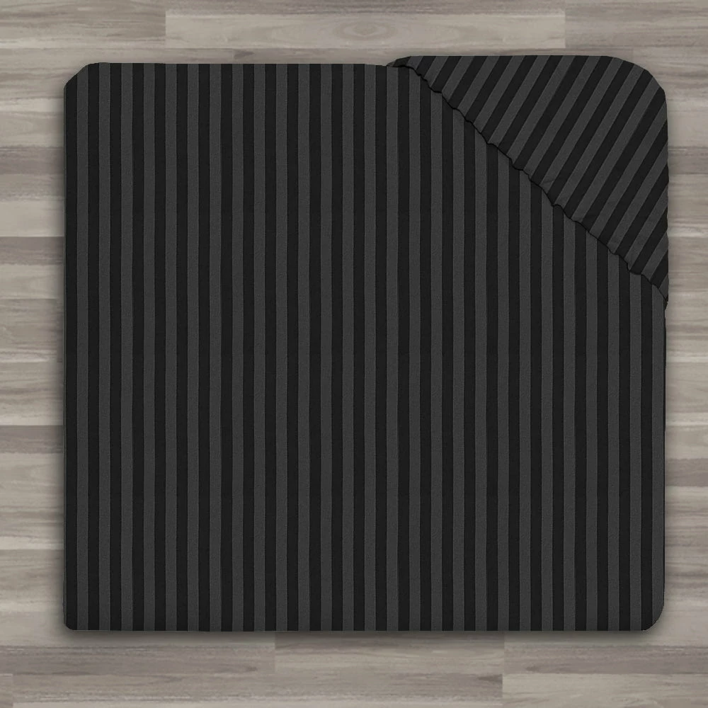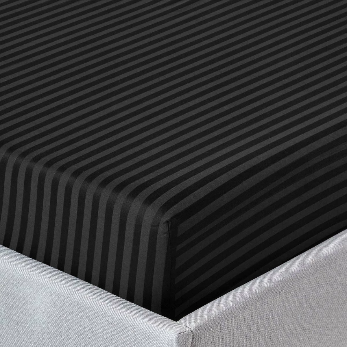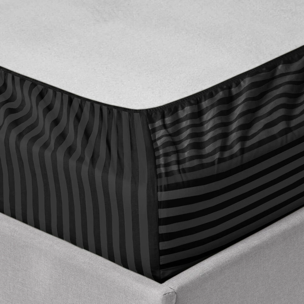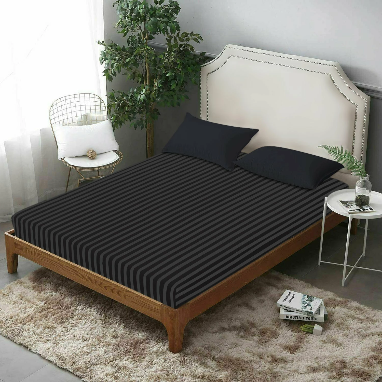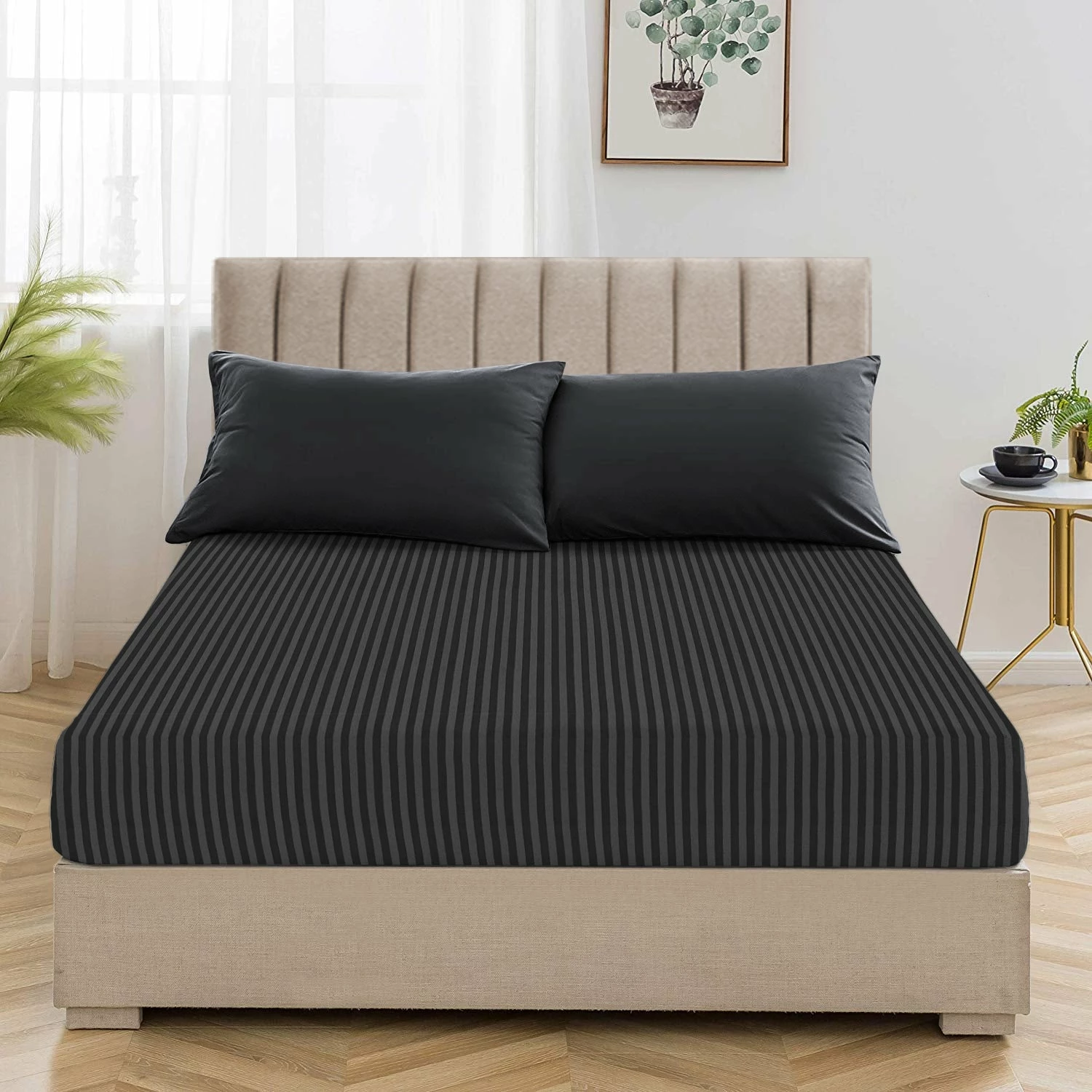 Cool and crisp, these new striped patterned 25cm black extra deep fitted sheets make an updated addition to your bedding for the ultimate clean and comfortable feel. The sleek interpretation of the finest microfiber weave confirms the ultra-soft, classic and relaxed experience all night. The embedded striped design displays a symmetric accent in the bedroom. The strong elasticized corners at four corners are at 25cm depth to snug fit on the deeper mattresses. Accent pillows with the same striped design harmonize the bed base. What else? Our exclusive deep-fitted striped pattern sheets are now available in stunning colours and standard bed sizes.Â