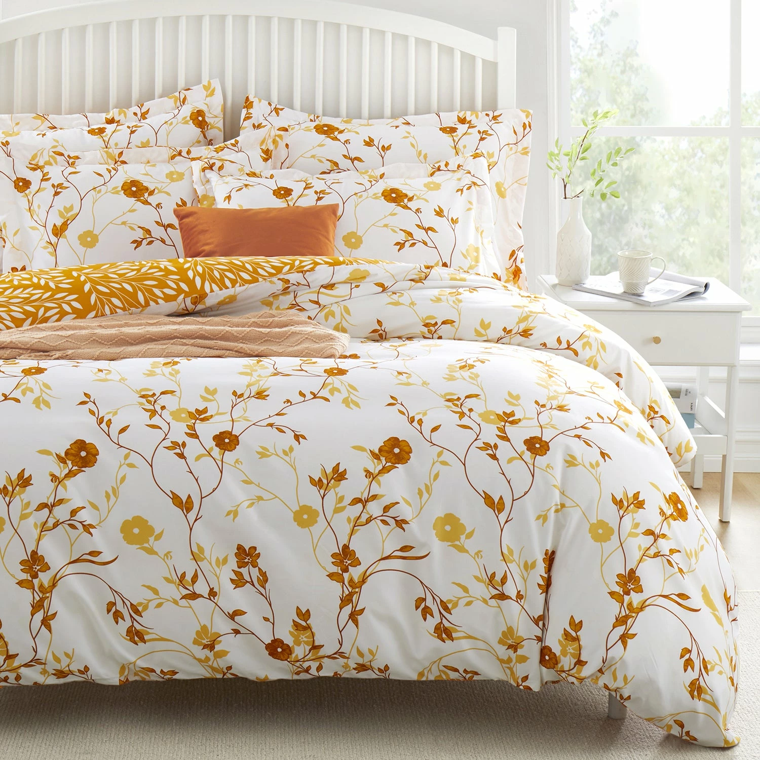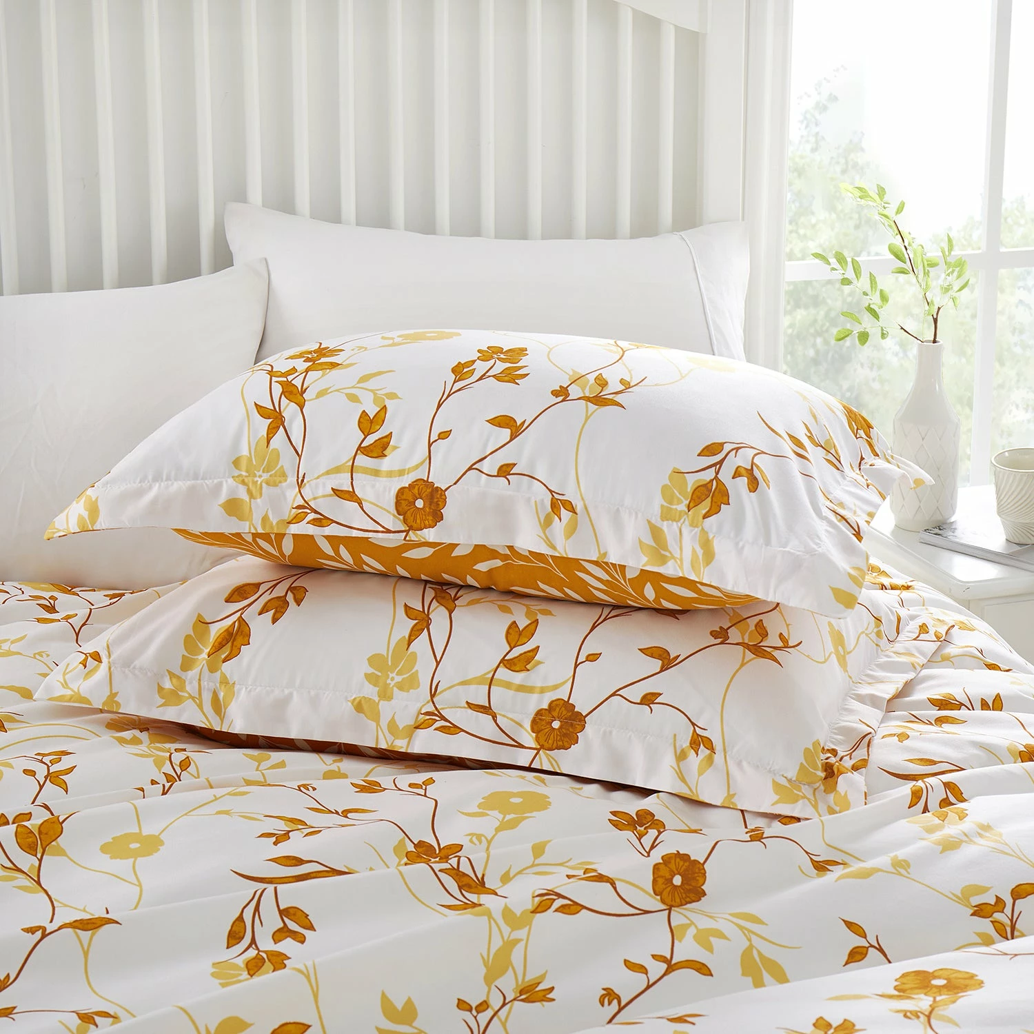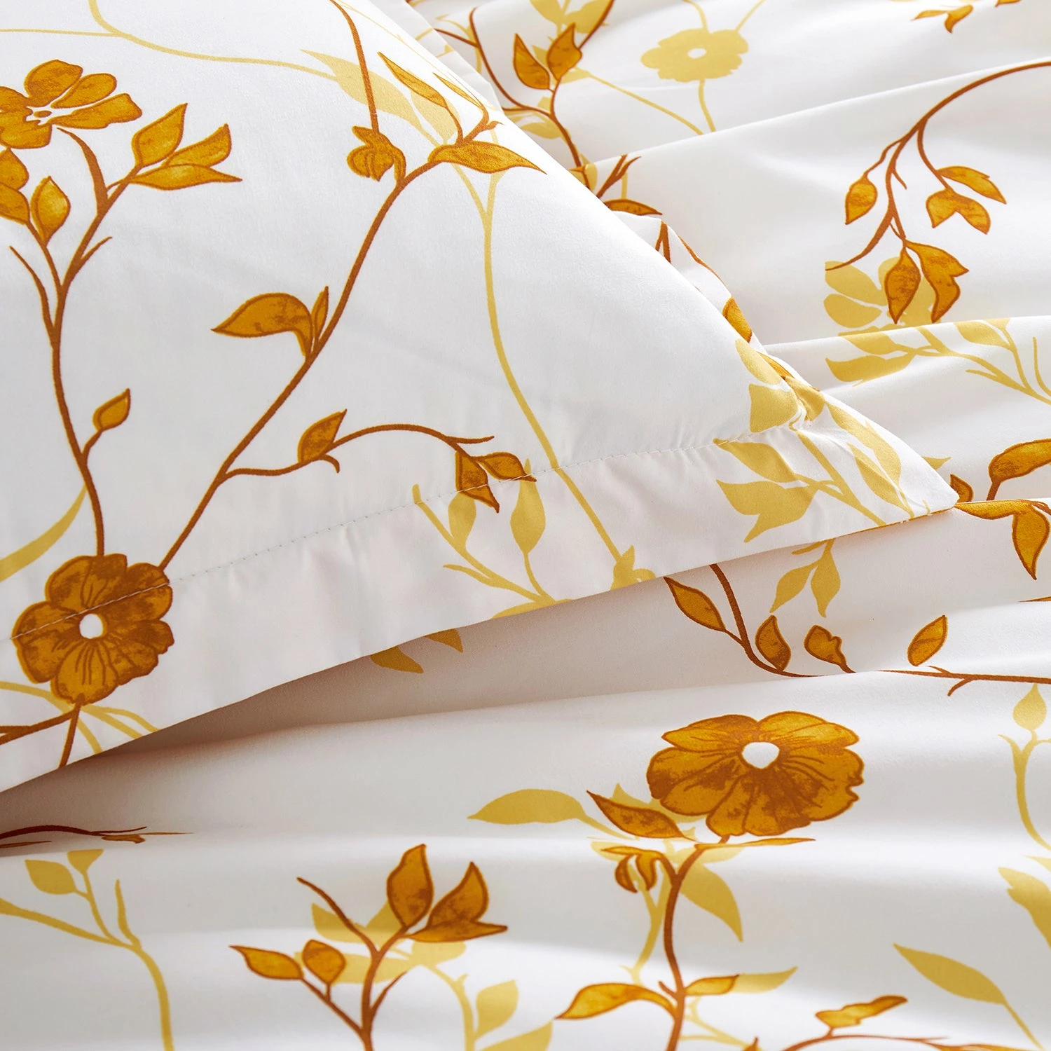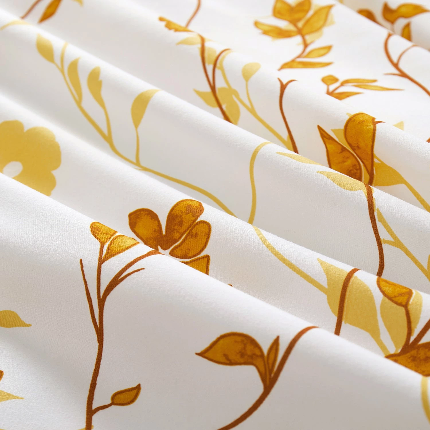 This microfiber floral duvet cover set in ochre flower prints is a complete range that makes your bedroom stylish and glorifies it. This ochre flower printed bedding feel-good fabric and high-quality duvet cover set come with coordinating pillow covers that have floral themes all over, making an ideal troupe to treat your bed. Internal ties and the closure makes sure that the duvet cover stays in place and prevents slipping. This 3 piece duvet cover set works well on all-season duvets. All you need to do is simply layer your duvet or comforter with this printed duvet cover set and create that peaceful serene place to sleep you have always dreamt of.Â