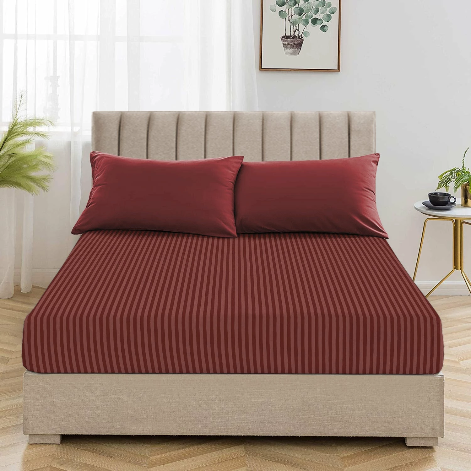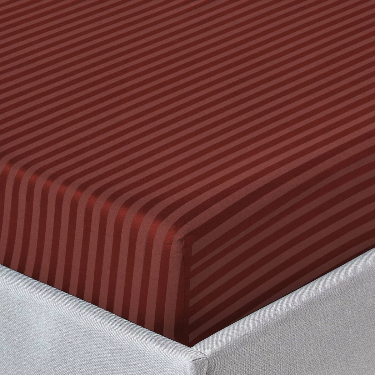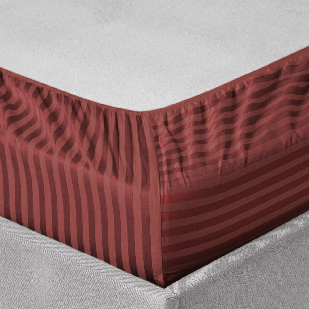 Cool and crisp, these new striped patterned 25cm extra deep burgundy fitted sheets make an updated addition to your bedding for the ultimate clean and comfortable feel. The sleek interpretation of the finest microfiber weave confirms the ultra-soft, classic and relaxed experience all night. The embedded striped design displays a symmetric accent in the bedroom. The strong elasticized corners at four corners are at 25cm depth to snug fit on the deeper mattresses. Accent pillows with the same striped design harmonize the bed base. What else? Our exclusive extra deep fitted sheets striped pattern are now available in stunning colours and standard bed sizes.Â