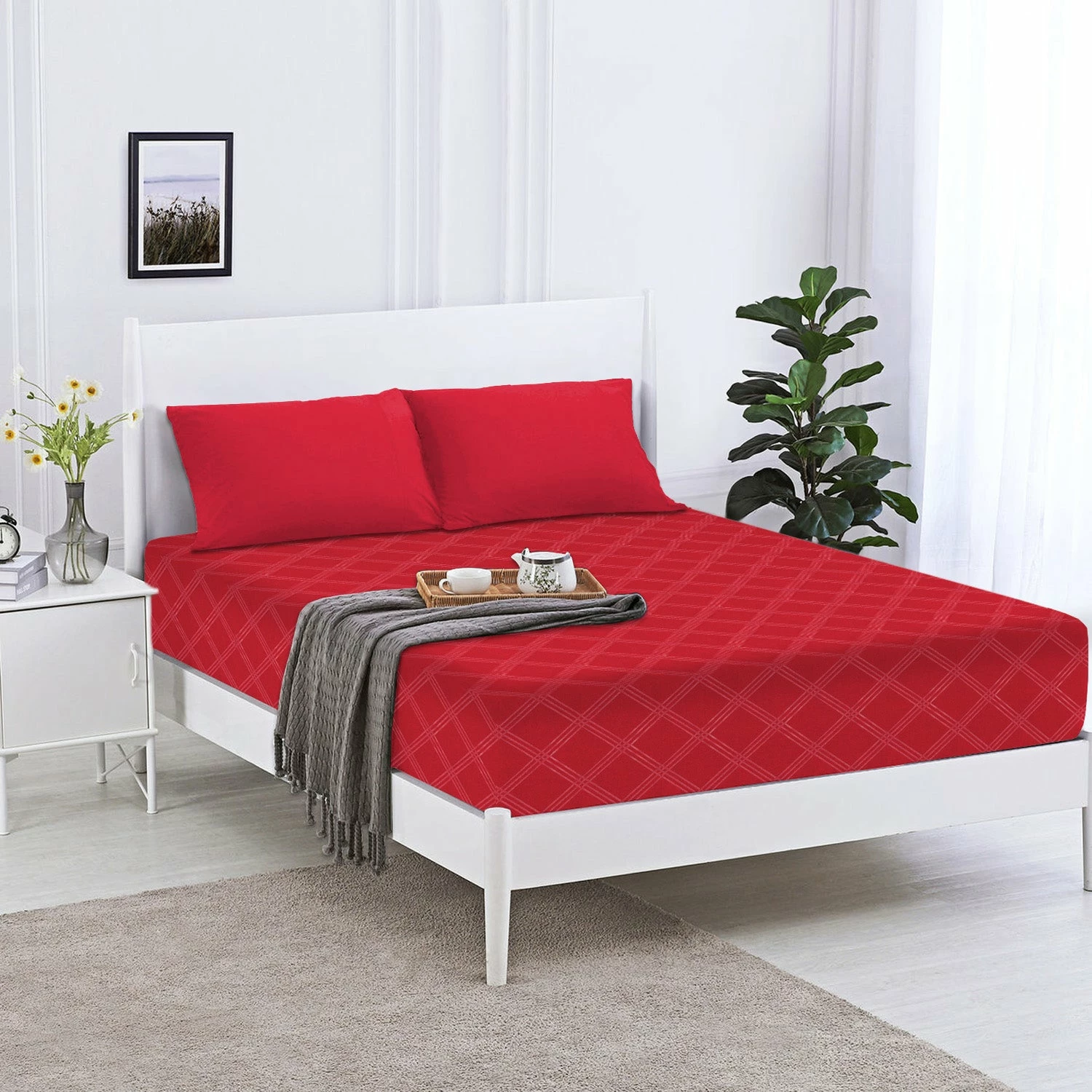 Super King Size Bed Sheet Extra Deep Red Fitted Sheet Embossed Pattern